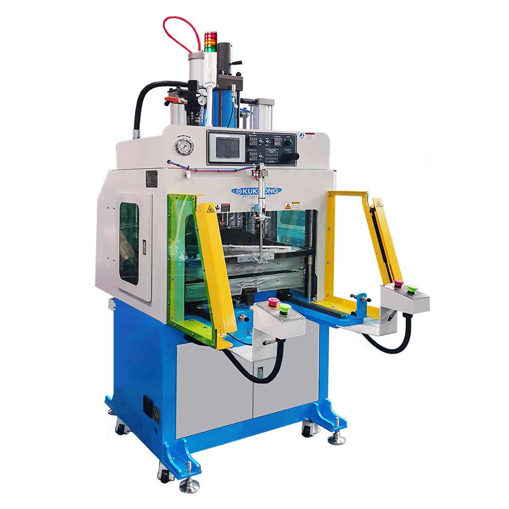 This machine is comprised of frame parts, upper plate, bottom plate, pillar. heat plate, booster cylinder, pneumatic parts, electronic parts etc and used for manufacturing to pressing by attaching the fuse mould between the upper plate and bottom plate.