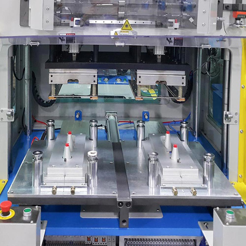 - This machine is comprised of frame, upper plate middle plate, bottom plate, upper & bottom jig, booster cylinder, pneumatic part, vacuuming part, electronic part etc.