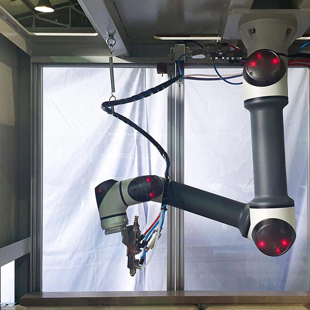 This system allows to glue on the outsole to bond with help from the aqueous bond property. The robotic system increases precision and productivity as it apples aqueous bond.